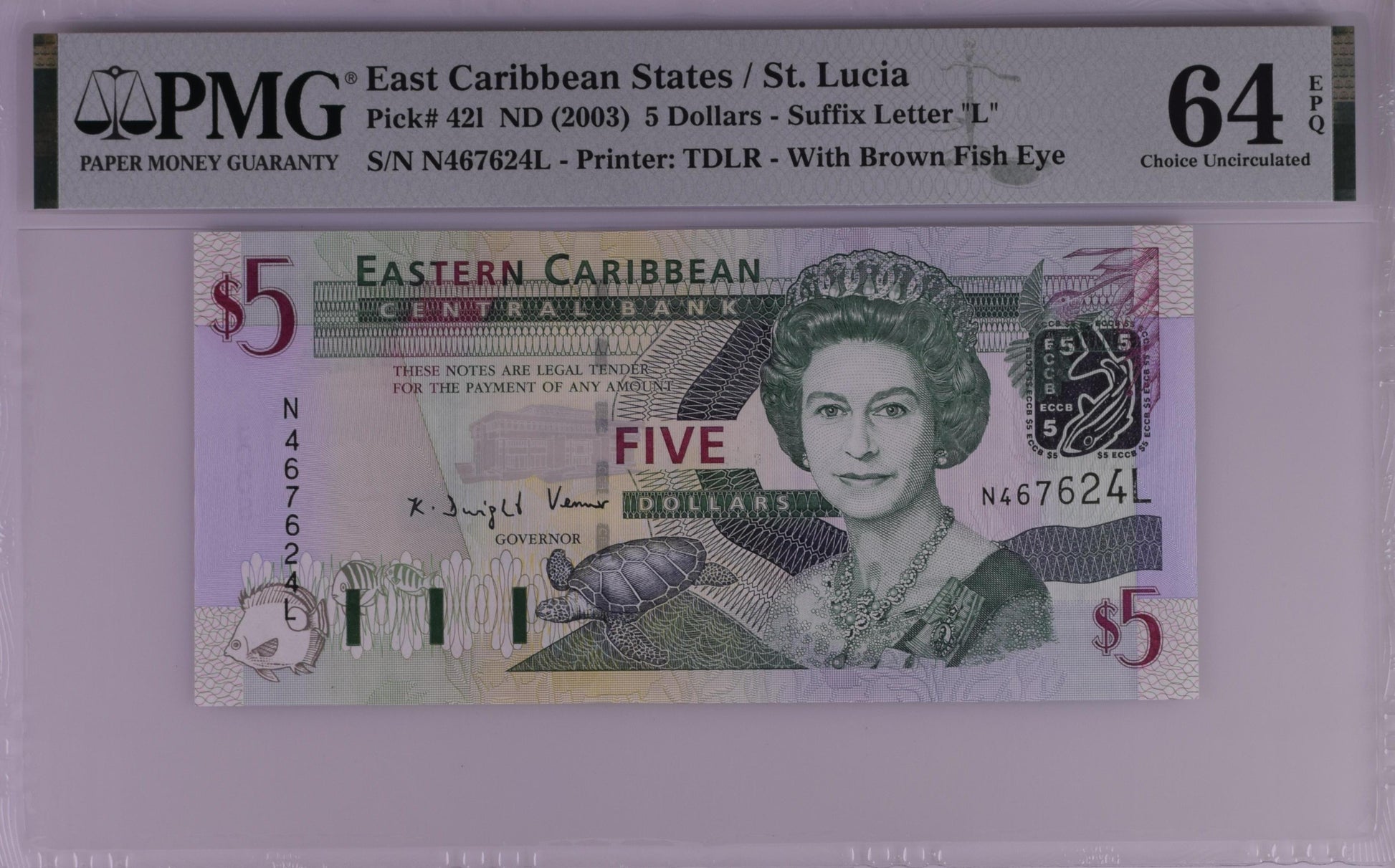 East Caribbean States / St. Lucia ND (2003) P-42l PMG Choice UNC 64 EPQ 5 Dollars