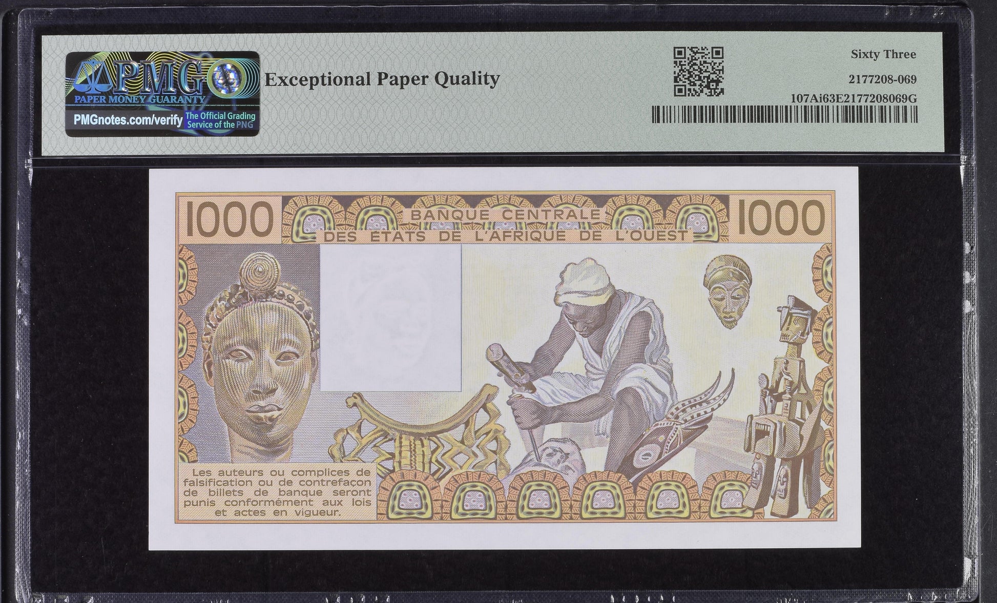 1000 Ivory Coast banknote from 1989, PMG Choice UNC 63 EPQ grade. An exceptional piece for notaphily collectors seeking rare examples from West African states. This vintage banknote stands out for its impeccable condition and professional authentication, making it a valuable addition to your foreign banknote collection. Ideal for those who appreciate African monetary history and wish to own a high-quality, verified numismatic treasure.